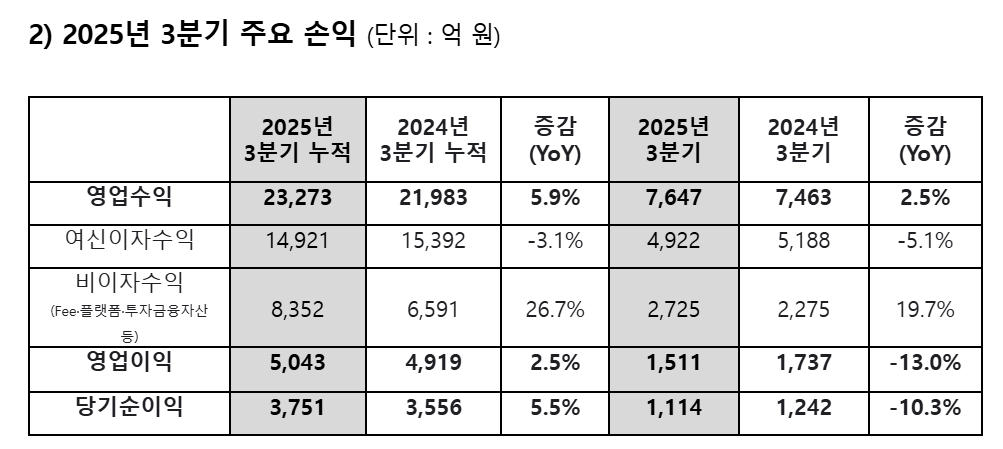 대출이자수익을 제외한 비이자수익은 3분기 누적 8352억원으로 전년 동기 대비 26.7% 증가했다. 전체 영업수익(2조 3,273억 원) 중 비이자수익의 비중은 36%로 전년(30%)과 비교해 6%포인트 높아졌다.
