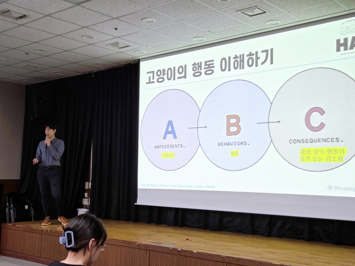 이어진 강연도 반려인능력시험 출제위원인 이우장 하이반려동물행동클리닉 원장의 ‘고양이 문제행동 올바르게 이해하기’였다. 그는 반려묘 75.7%가 최소 1개 이상의 행동문제가 있으나 54%만이 수의사와 상담을 한다는 연구결과 자료에 더해 “고양이의 행동 변화는 사실상 유일한 건강 이상 신호라 중요하다”며 “명확한 트리거(계기) 없이 평소 하지 않던 행동을 갑자기 하는 경우에는 신속한 메디컬적 확인이 필요하다”고 강조했다.