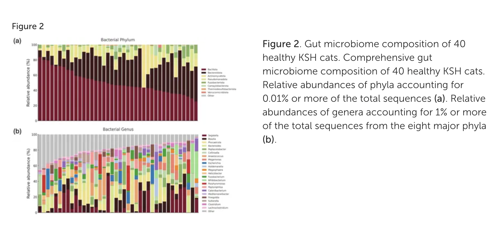 이번 연구는 한국 반려묘 중 가장 많은 비율을 차지하는 코리안숏헤어 품종 고양이를 대상으로 건강한 상태에서의 장내 미생물 생태를 처음으로 체계적으로 분석한 것이 특징이다. 연구진은 40마리의 건강한 고양이를 대상으로 대변 샘플을 수집해 16S rRNA 시퀀싱을 통해 마이크로바이옴 구성을 파악했다.