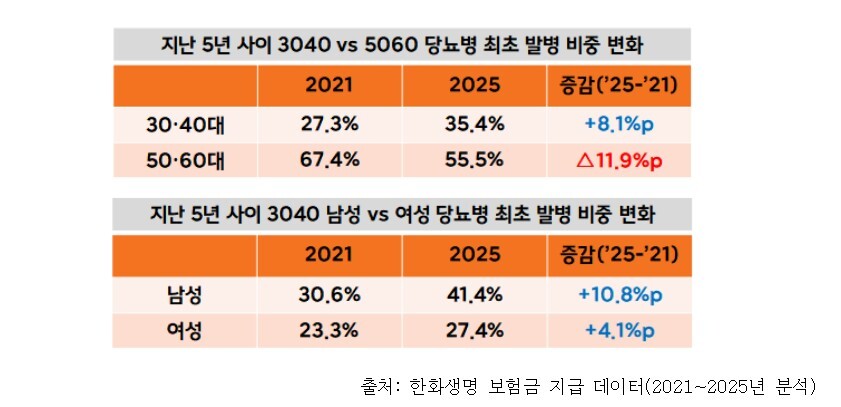 한화생명에 따르면 2021년에는 당뇨 관련 보험금청구는 5060세대 비중이 높았다. 당뇨로 실손보험금을 청구한 고객의 67.4%가 50∙60대였다. 30∙40대는 27.3%에 불과했다.