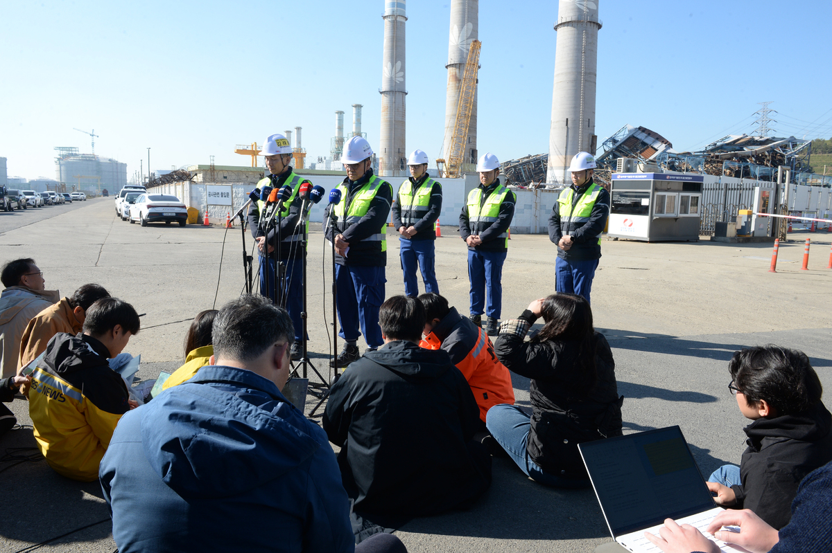 15일 울산 남구 용잠동 한국동서발전 울산화력발전소 대형 구조물 붕괴현장에서 공사 하청업체 코리아카코 관계자들이 매몰자 사고수습을 마무리하며 현장 브리핑을 하고 있다. 뉴시스