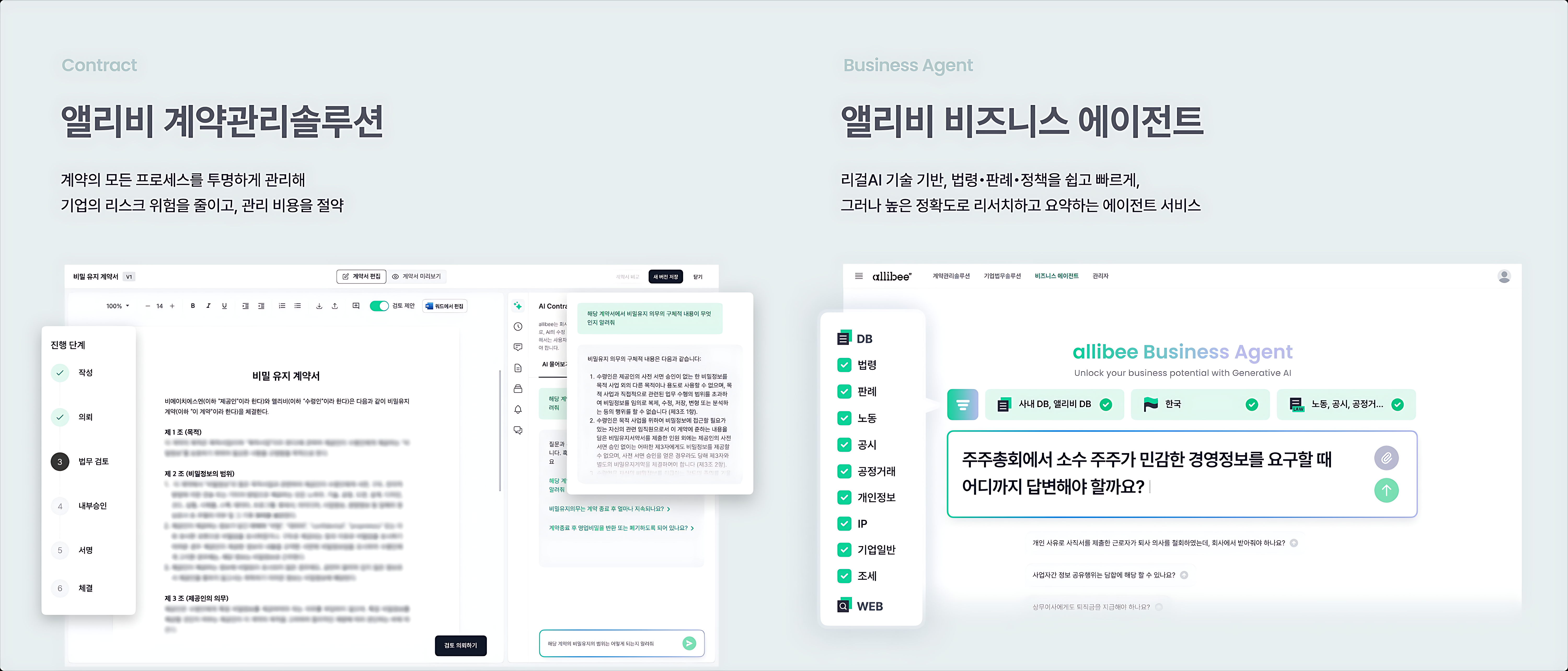 BHSN은 지난해 1월 구독형 리걸 AI 솔루션 앨리비를 정식 출시하며 리걸테크 시장에 본격적으로 뛰어들었다. ‘AI를 통해 기존 업무의 불편함으로부터 자유롭게 한다’는 뜻의 ‘AI + Liberate’에서 파생된 이름처럼 앨리비는 기업 법무의 복잡한 과정을 간소화하고 업무 속도를 높이는 데 초점을 맞췄다. ▲계약서 작성에서 검토·승인·결재·보관, AI 검색까지 계약 전 과정을 지원하는 ‘앨리비 계약관리솔루션(CLM)’ ▲기업 법무팀의 자문·송무 관리를 지원하는 ‘앨리비 기업법무시스템(ELM)’ ▲국내외 법령과 판례, 정부 정책자료 등 방대한 전문 지식 데이터를 기반으로 정보 리서치를 제공하는 ‘앨리비 비즈니스 에이전트’로 구성됐다.