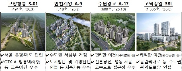 국토교통부는 26일 한국토지주택공사(LH)·서울주택도시개발공사(SH)·경기주택도시공사(GH)·인천도시공사(iH)와 내년 3월부터 연말까지 이 같은 규모의 공공분양주택을 순차로 공급할 계획이라고 밝혔다.