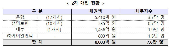 세부 채권액을 보면 은행 5410억원(3만7000명), 생명보험 535억원(7000명), 대부업 1456억원(1만9000명), 케이알앤씨(예금보험공사 자회사) 603억원(1만5000명)의 채권이 매입 대상이 포함됐다.
