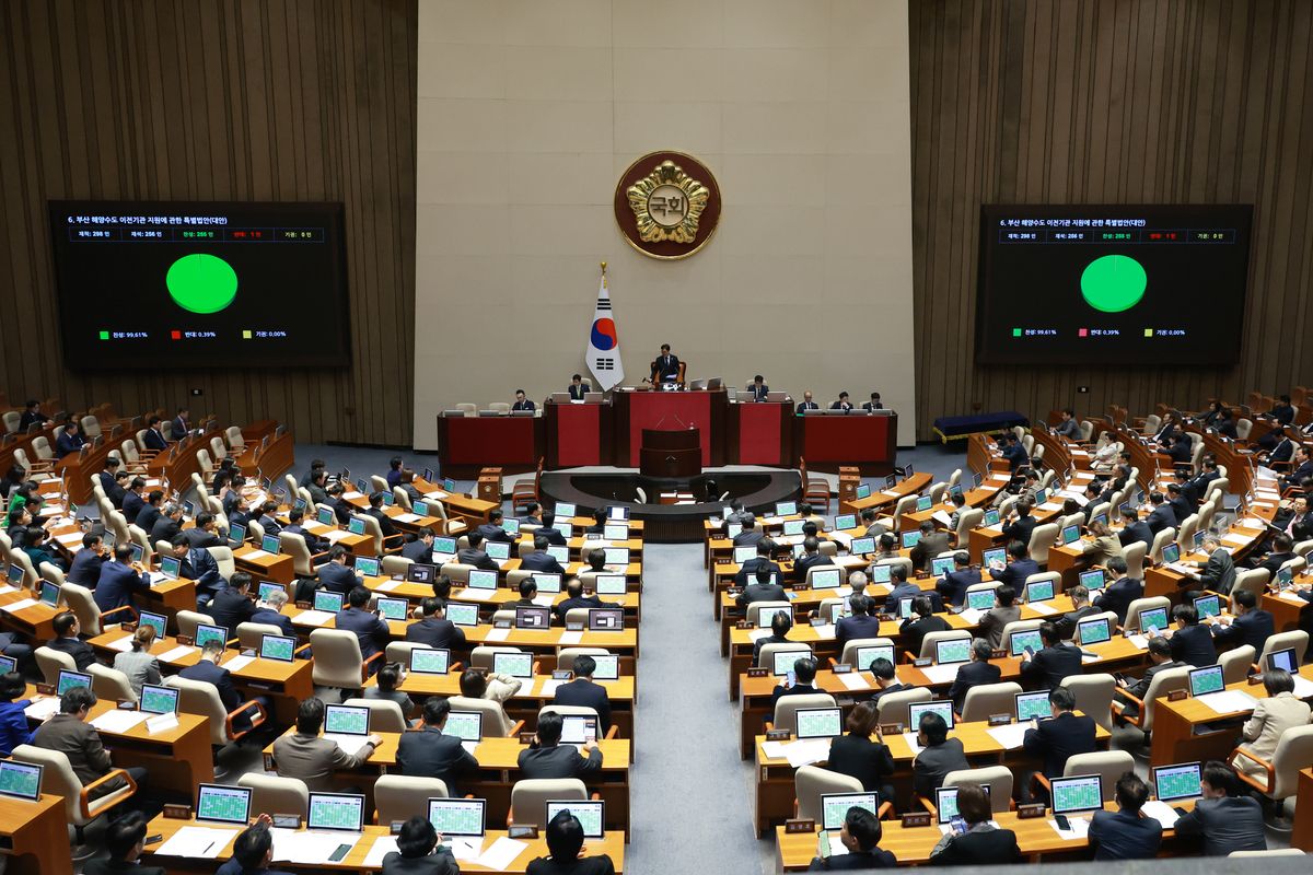 여야는 이날 오후 국회에서 본회의를 열고 ‘부산 해양수도 이전기관 지원에 관한 특별법안’을 가결했다.