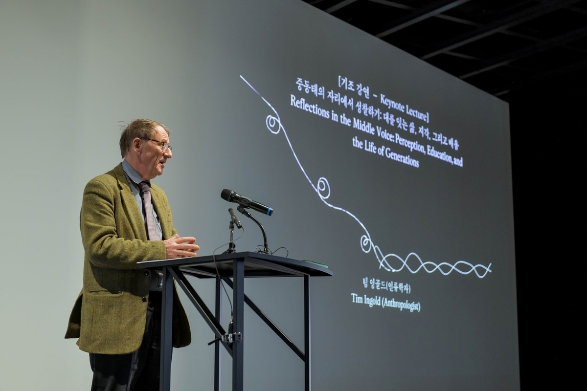 개막 프로그램은 11월 25일 잉골드 교수의 기조 강연으로 시작됐다. 잉골드는 ‘중동태의 자리에서 성찰하기: 대를 잇는 삶, 지각, 그리고 배움’을 주제로 한 강연에서 능동과 수동의 이분법을 넘어, 행위와 변화가 공명하는 과정, 즉 ‘중동태(middle voice)’ 개념을 제시하며, 관계 속에서 생성되는 ‘앎’의 과정을 탐구했다. "본다는 것은 곧 상상하는 것"이라며, 세상을 수동적으로 받아들이는 것이 아니라 적극적으로 참여하며 경험하는 것이 중요하다고 말했다. 또한 교육은 지식을 혼자 쌓는 것이 아니라 서로 나누며 함께 성장하는 과정('커머닝, commoning')이라고 설명했다. 강연 중간에 르네 마그리트의 작품을 예로 들며 지각을 상상력의 영역으로 설명하는 등 철학적 사유를 시각 예술과 연결해 청중들의 깊은 호응을 이끌어냈다.