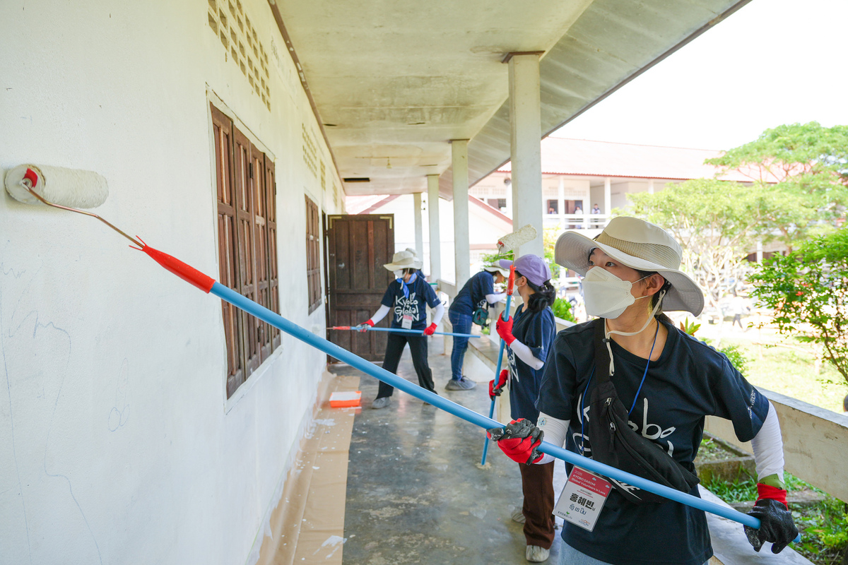 교보생명의 부천FP지원단 소속 홍모 씨가 본인의 키높이 만한 장대에 달린 롤러에 페인트를 듬뿍 묻힌 뒤 도서관 건물 외벽에 칠을 하기 시작했다. 강한 페인트 냄새가 마스크를 뚫고 코끝에 닿았지만 홍 씨는 손놀림을 멈추지 않았다.