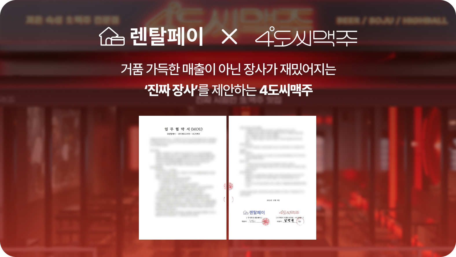 핀테크 결제 플랫폼 렌탈페이가 외식 프랜차이즈 브랜드 4도씨맥주와 업무협약(MOU)을 체결하고 가맹점의 창업비용부터 운영비용까지 카드로 결제할 수 있는 비즈니스 결제 시스템을 전면 도입한다고 10일 밝혔다.