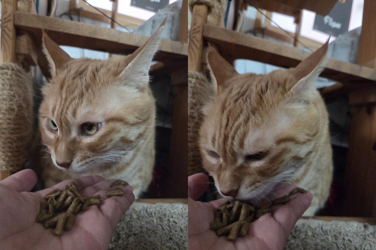 레옹이가 16%에 속하지 않길 기원하며 우선 참치맛을 손바닥 위에 올려 입 앞으로 대령했다. 잠시 냄새를 맡더니 이내 오독오독 씹어 먹는다. 곧이어 올려준 연어맛도 잘 먹는다. 성공이다. 벳플의 ‘바삭한 식감과 풍미를 살린 특수코팅 공법’이 통했나 보다. 평소 가리는 것 없는 또 다른 반려묘 ‘부부’는 역시나 잘 먹는다.