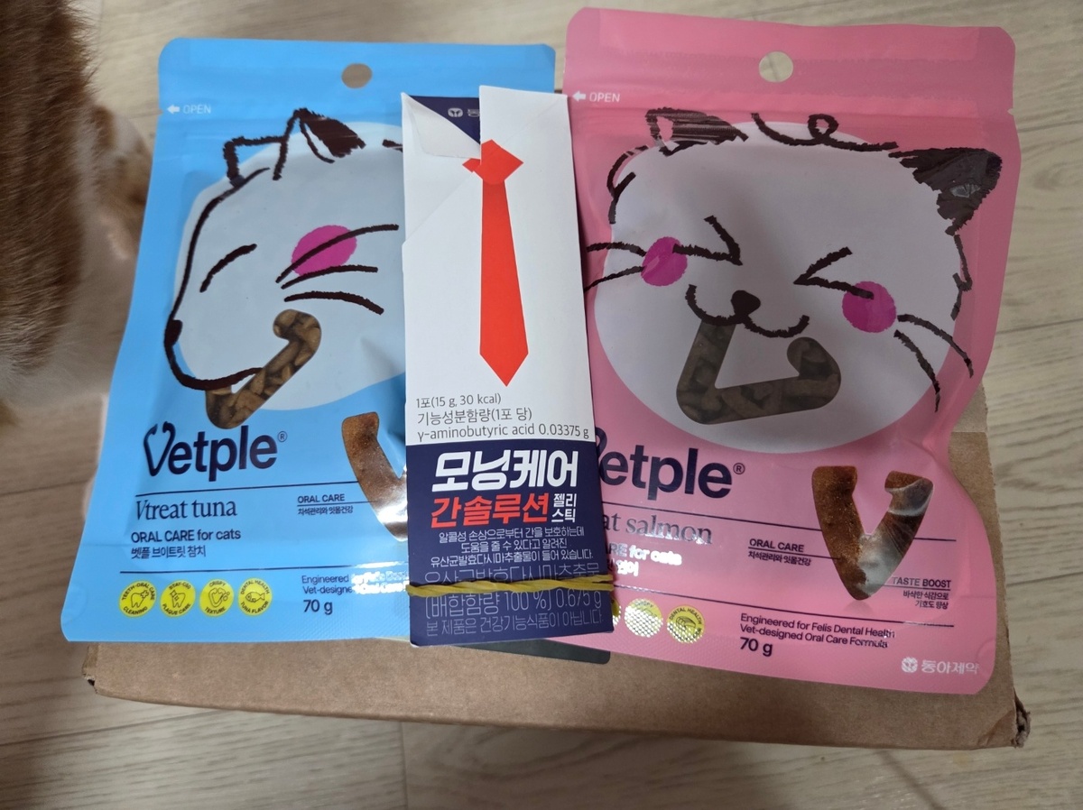 최근 동아제약의 반려동물 영양제 브랜드 벳플(Vetple)이 고양이용 구강관리 스낵 ‘브이트릿’ 2종을 출시했다는 보도자료를 받았다. 양치질이 쉽지 않은 고양이가 매일 즐겁고 맛있게 섭취하면서 구강 관리를 할 수 있는 제품이란다. 쭉 읽다가 ‘동아제약 임직원 반려묘를 대상으로 진행한 기호도 테스트에서 84%라는 높은 선호도를 기록했다’는 문구에 홀려 인터넷 판매처에서 구매 버튼을 눌렀다.