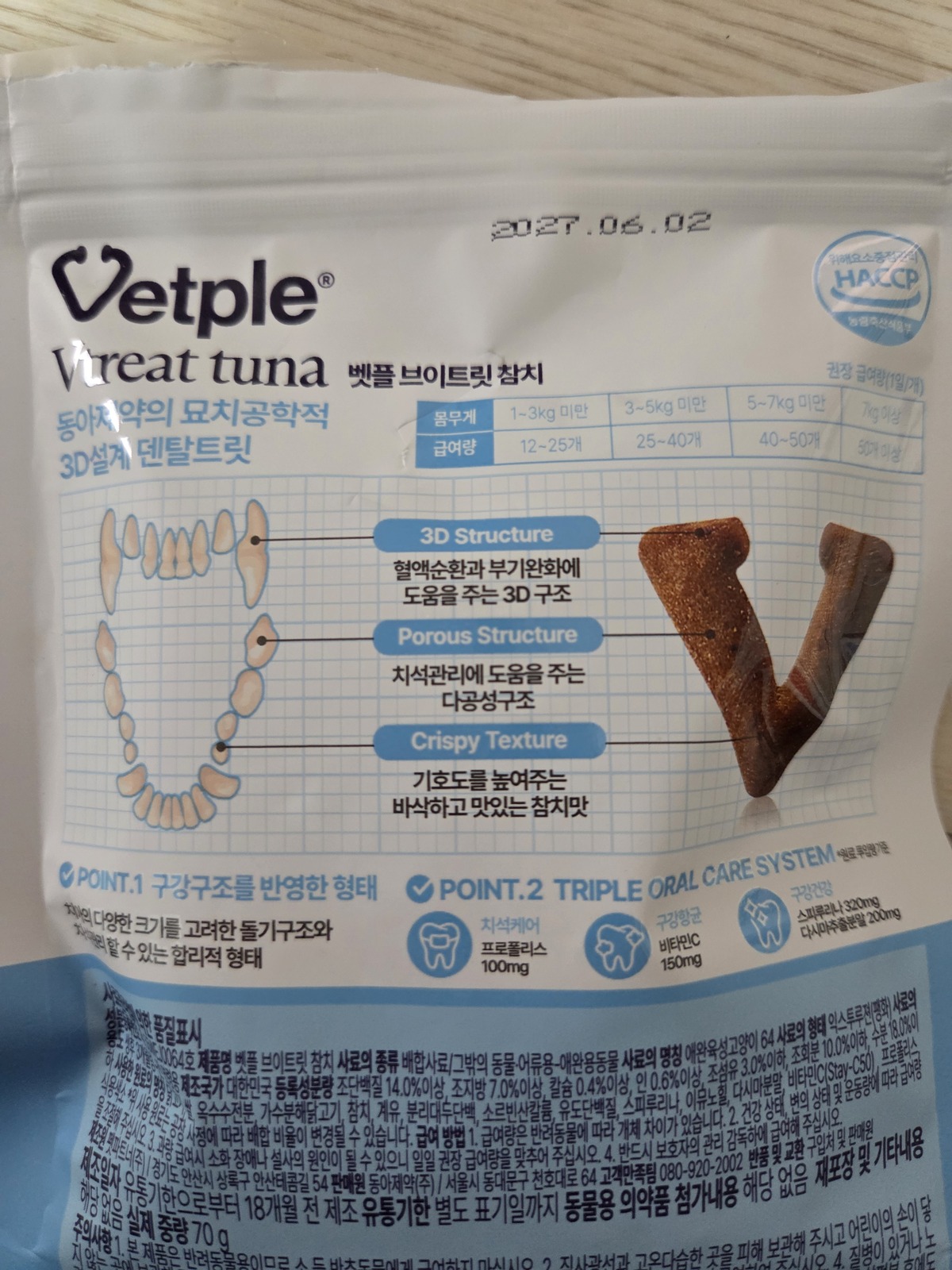 구매 상품이 배송돼 언박싱을 했다. ‘V’자 모양의 제품 형태와 이것을 입에 물고 있는 고양이 일러스트의 패키지가 우선 눈에 띈다. V는 벳플 제품 개발 과정에서 전문 수의사(Vet)가 함께함을 강조하는 브랜드 로고의 머리글자이기도 하다. 개봉을 해서 냄새를 맡아보니 고소한 향이 코를 자극한다.