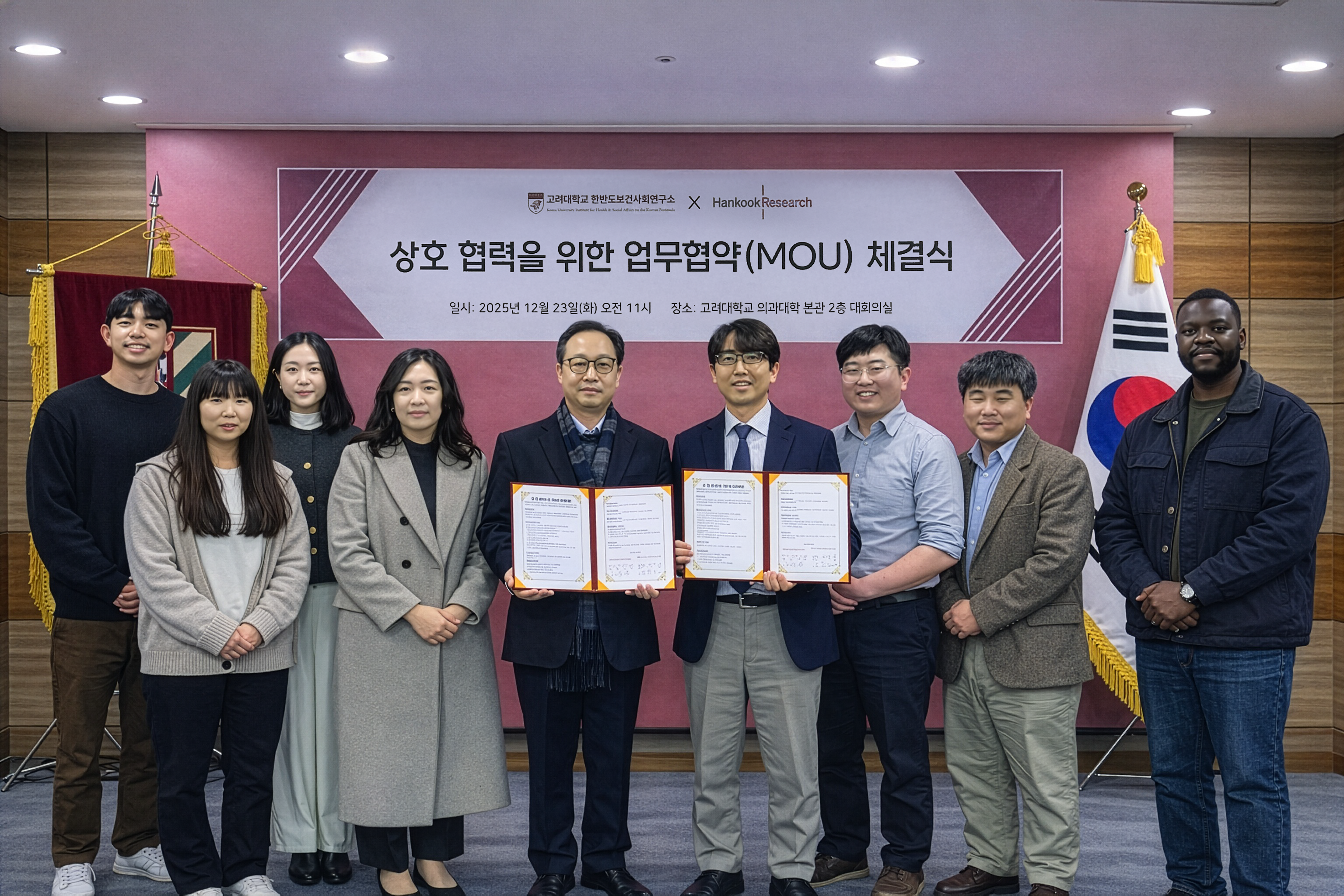 ㈜한국리서치(대표이사 노익상)는 2025년 12월 23일 오전 11시 고려대학교 의과대학 본관 2층 대회의실에서 고려대학교 한반도보건사회연구소(소장 이요한)와 업무협약(MOU)을 체결하고 보건·의료·사회 분야 연구 협력을 본격화한다고 6일 밝혔다.