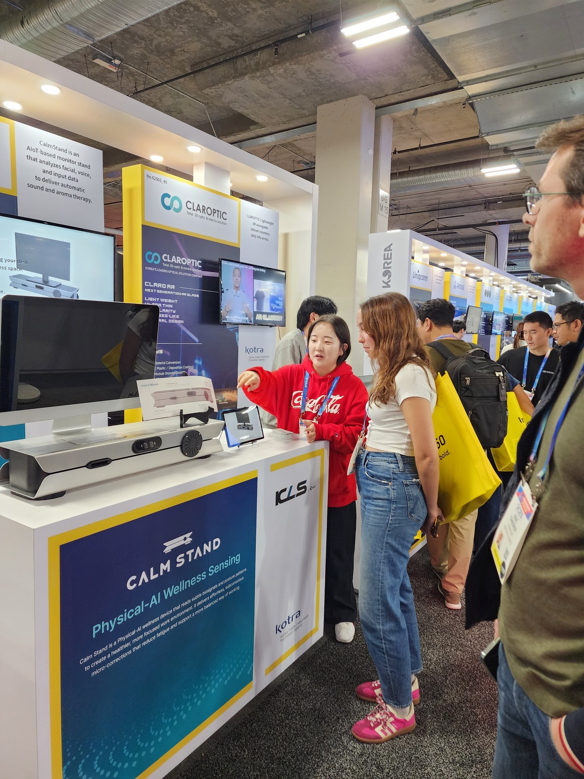 이번 전시에서 선보인 캄스탠드는 단순한 모니터 받침대를 넘어 사용자의 상태를 AI가 인식해 자동으로 반응하는 기능을 갖췄다. 사용자의 스트레스 신호를 감지해 높이를 조절하고 심리 안정에 도움이 되는 테라피 사운드와 아로마를 분출하는 기능을 갖춘 것이 특징이다.