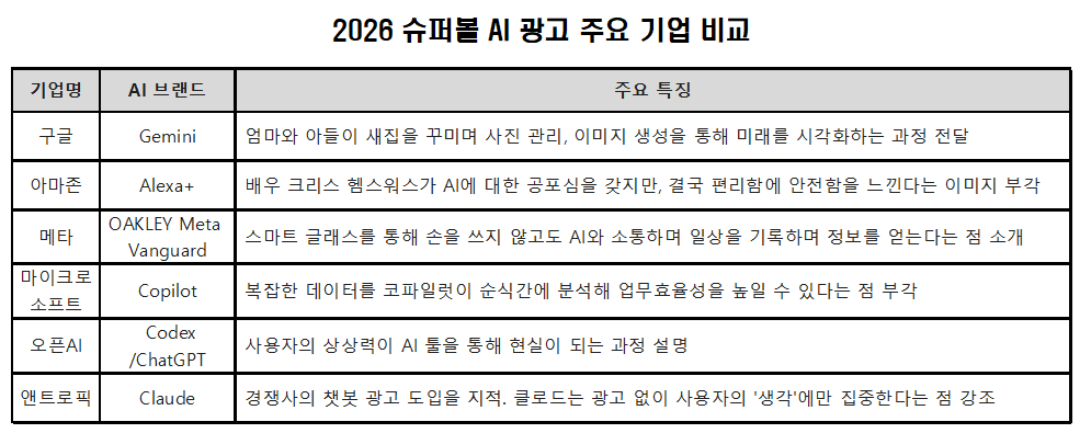 지난 9일 열린 미국 최대의 스포츠축제 제60회 슈퍼볼(슈퍼볼 LX)은 그 어느 해보다 인공지능(AI) 및 빅테크 기업들의 중간 광고 경쟁이 치열했다. 과거엔 새로운 제품과 기술을 소개하는 정도였다면, 올해 광고에선 AI가 일상의 비서 또는 업무 파트너로서 사용자에게 구체적인 도움을 줄 수 있다는 점이 주를 이뤘다. 슈퍼볼 중간 광고 비용은 30초당 평균 800만 달러(한화 약 117억원). 막대한 비용에도 불구하고 AI 주도권을 잡으려는 글로벌 IT 기업 간 불꽃 튀는 마케팅 전쟁이 슈퍼볼에서 재현됐다는 평가다.