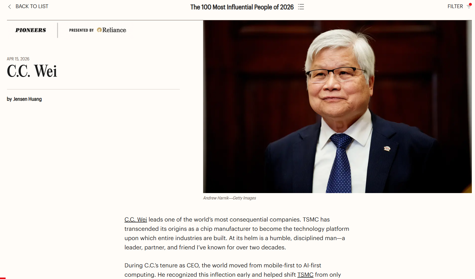 젠슨 황 엔비디아 CEO는 웨이 회장에 대해 타임에 작성한 글에서 웨이 회장에 대해 “세계에서 가장 중요한 기업 중 하나를 이끄는 인물”이라면서 “TSMC는 단순한 칩 제조업체라는 출발점을 넘어, 산업 전체가 그 위에 구축되는 기술 플랫폼으로 자리매김했다”고 설명했다.