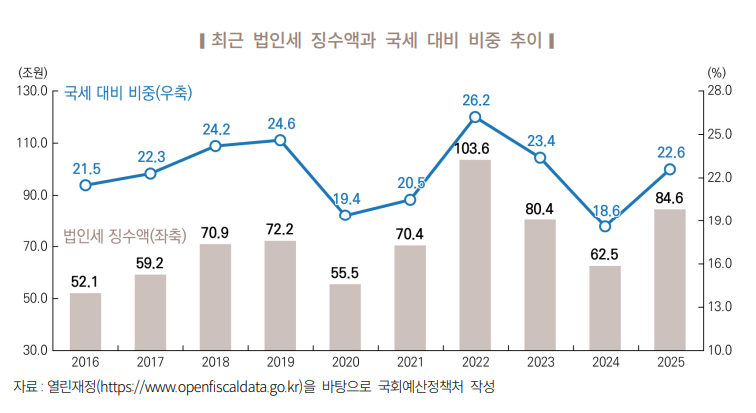 반도체 호황에 따라 법인세 수입이 전체 국세수입에서 차지하는 비중도 재차 확대될 것으로 예상된다. 국회예산정책처가 지난달 내놓은 ‘2026년 대한민국조세’ 보고서에 따르면 법인세 수입이 전체 국세수입에서 차지하는 비중은 2022년 26.2%까지 상승했다가 2024년 18.6%까지 하락했다. 이후 지난해 들어 22.6%로 반등했다. 국회예산정책처는 이에 대해 “코로나19 이후 중동지역 등의 분쟁, 보호무역 기조 확산 등으로 대외경제의 불확실성이 확대됨에 따라 반도체 등 수출 비중이 큰 주요 업종을 중심으로 법인 영업실적의 변동성이 확대된 데 따른 것”이라고 분석했다.